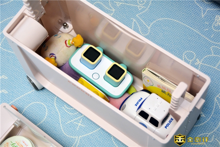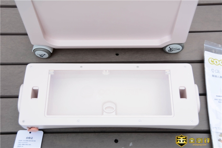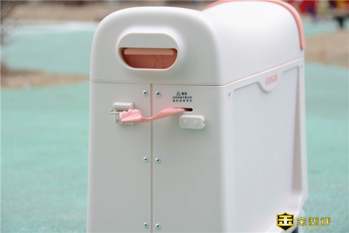 箱体采用磨砂设计,使用了ABS材质,亲肤接触舒适,打开也没闻到异味,而且比PC材质更坚硬,具有不错的耐磨性。四角圆润的设计,避免小朋友意外碰到产生危害。上端箱体顶部有个软胶的把手,小朋友坐上去的时候可以扶着,防止在玩耍过程中倾倒。家长在搬动时也可以提着用。