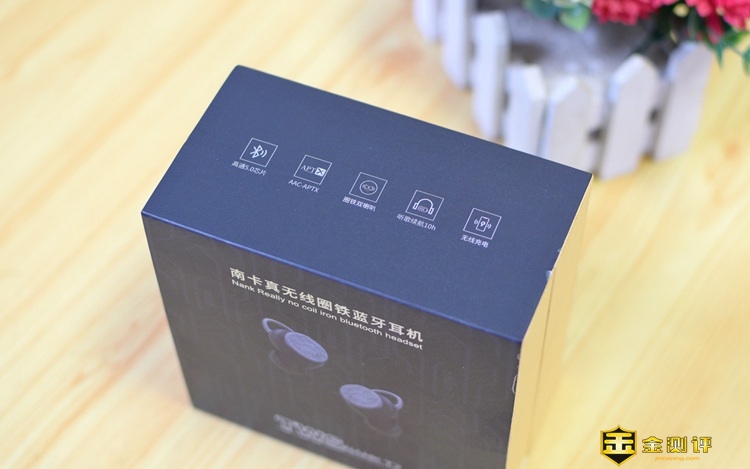 包装盒的侧面,印有耳机的外观图案,顶部是蓝牙5.0、ACC-ATPX、圈铁双喇叭、10小时续航、无线充电等主要特点的标识,这其中,小编还是比较看好10小时续航能力的,毕竟现在主流的蓝牙耳机续航大多都是短板,能有5-6小时续航的,那都很少了