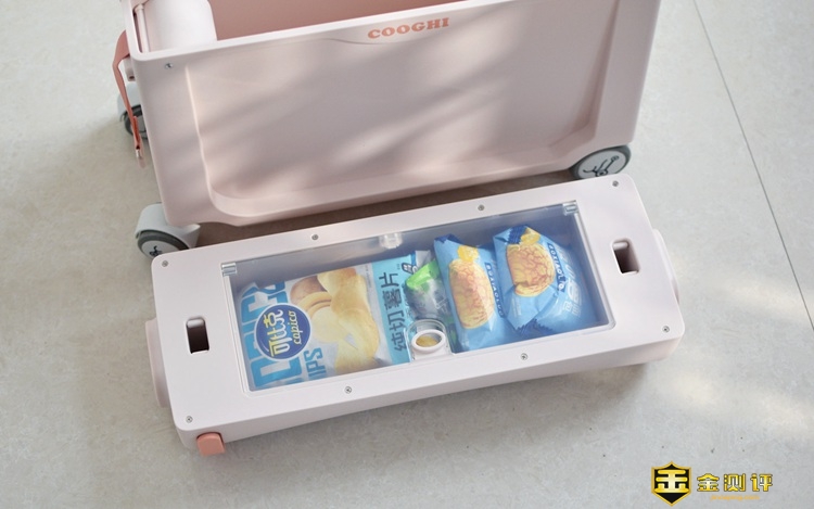 箱子内部是大空间的设计,中部有加强的铆钉结构,里面可以放一些衣物;上盖上面还设计了透明隔层,可以单独存放一些孩子喜欢吃的零食之类的,做到一箱两用,互不影响