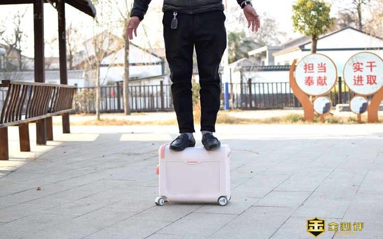 这款箱子整体采用加厚ABS材料,同时还在中部设计有加强带,所以在耐用方面,还是值得放心的,说明书标称骑行称重50公斤,而小编体重70多公斤,踩在上面也没有任何问题,所以更不用担心孩子会把它弄坏了