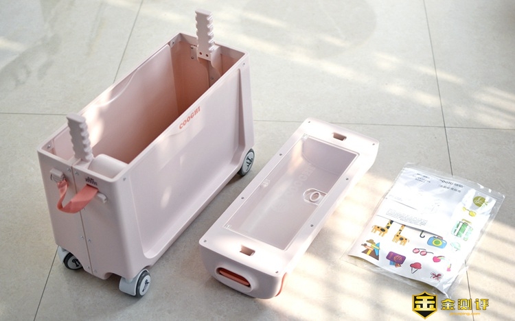通过按压箱子两侧的开关,就能取下上盖,里面是说明书以及卡通贴纸,可以让孩子给箱子贴上喜欢的图案