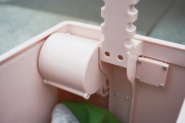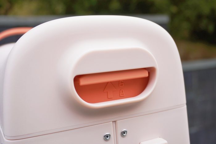 顶盖的两侧有两个按键,向上同时按压提拉,就可以分5档打开顶盖。孩子坐的时候可以根据身高来调整座椅高低。