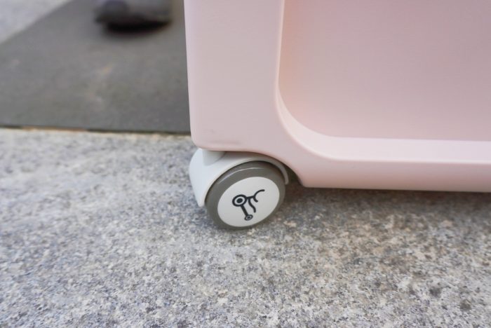 底部有4个轮子,前2个为万向滚轮,方便滑行;后两个为定向轮,可以一定程度控制方向和平稳度,4个轮子都是静音轮,滑动时不会有哐当哐当的声音。