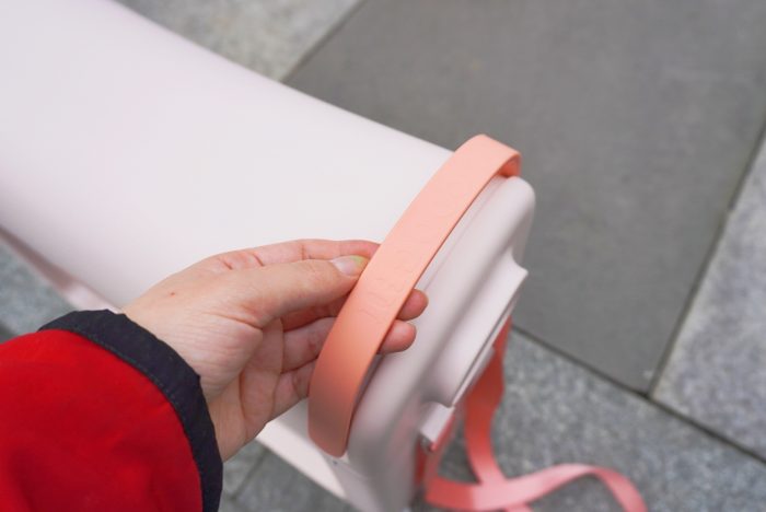 顶部除了一块宽大的乘坐区域外,在前端有一个手提拉环,它有两个作用:一是手提时需要,二是孩子乘坐时可以拉住保持平衡。