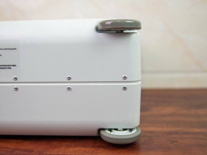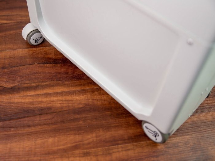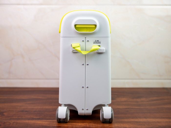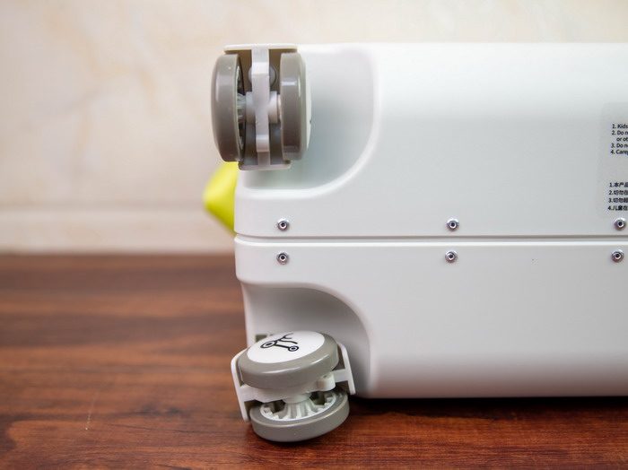 酷骑儿童行李箱的前端设计有两个万向轮,可以灵活转向,尾端设计有两个静音车轮,拖行和骑滑的时候更静音,而且据我观察,这四个轮子的减震效果也不错。