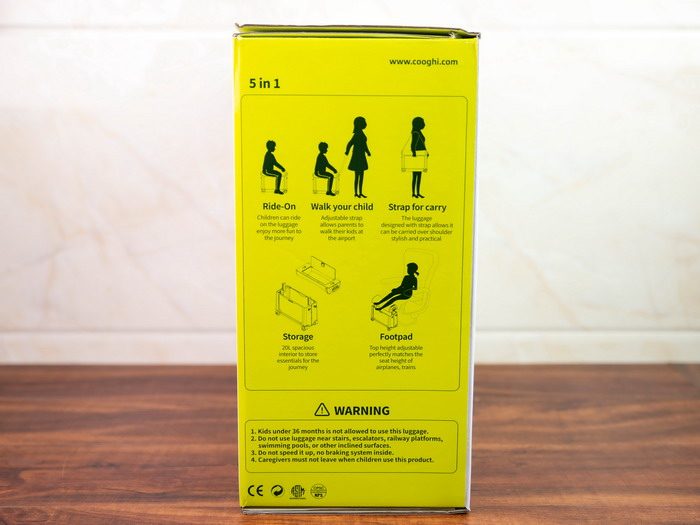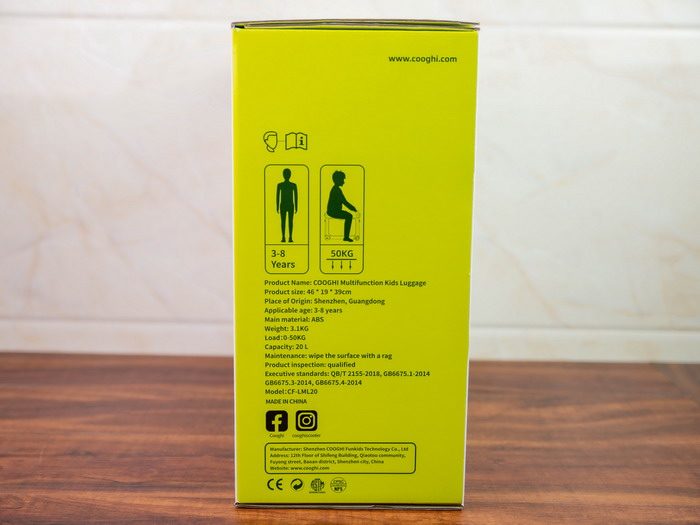 酷骑儿童行李箱的包装箱正面印有酷骑的品牌Logo,以及产品的渲染图,并且表明了这款产品有三种颜色。包装箱的左右两侧介绍了产品的使用方法和详细的规格参数信息。不过整个包装箱都是英文描述,建议增加中文。