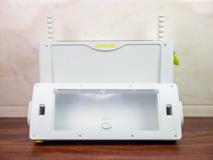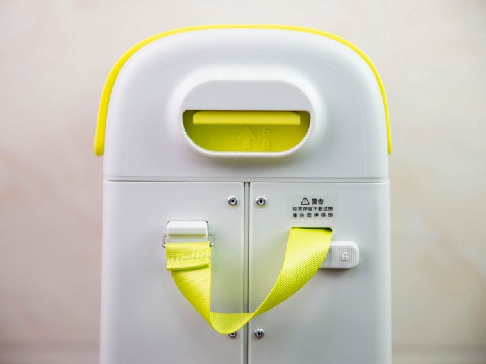 酷骑儿童行李箱分为上下两部分,箱顶部分通过两侧卡扣固定,往上按才能解锁,其中前端还设计有一个自动回弹拉带,通过磁吸卡扣固定,拉带固定在前端的时候,可以用来拖动酷骑儿童行李箱,拉带固定到尾端的时候,酷骑儿童行李箱就可以背起,这个设计非常好用。
