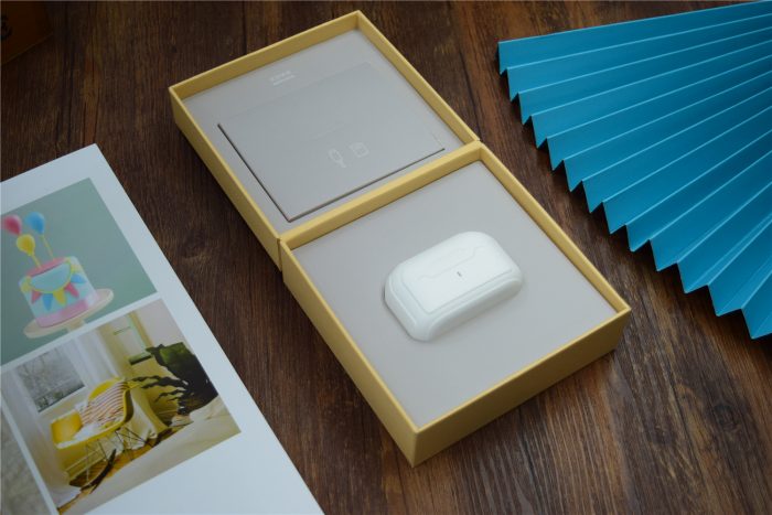 耳机外层的封皮比较紧,抽取的时候还是比较费力的,这点建议后期可以优化下。在内层是个杏黄色的硬纸盒,开启后可以看到内部物品摆放整齐牢固。