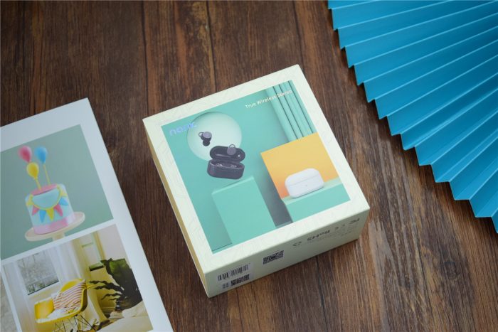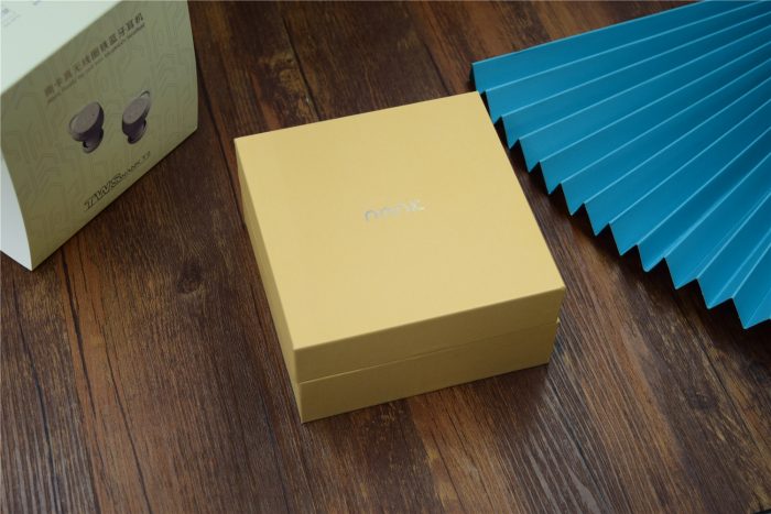 南卡T2采用了双层包装设计,外层为淡黄色配色+不规则底纹设计,正面印有耳机实物渲染图和产品名称。