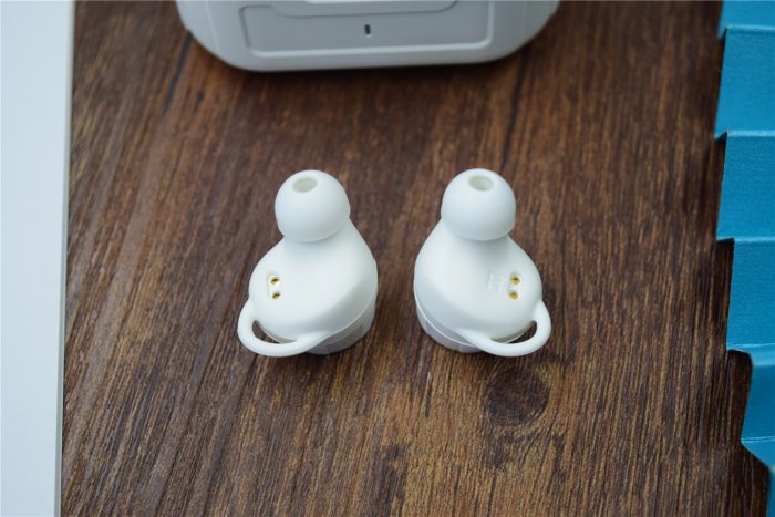 在耳塞背面印有“L”、“R”标识,可以方便用区分左右耳,另外旁边的两个金属触点是充电触点,耳机采用磁吸充电方式,放入充电仓中即可自动充电,让耳机随时保持充足电量。