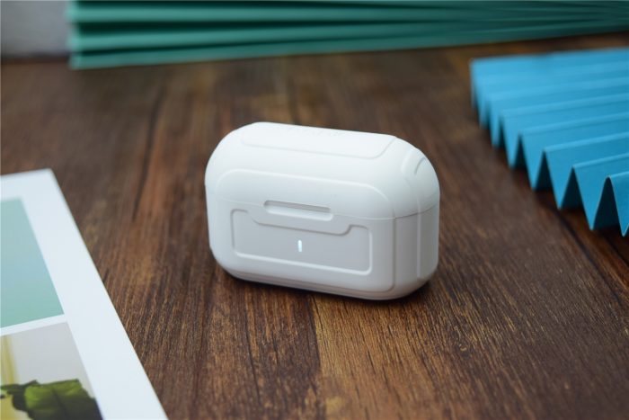 充电仓的正面盒盖开合处进行了内凹处理,更加方便用户开启盒盖,在靠近下方的中间位置还有个LED指示灯,可以根据指示灯的颜色来了解剩余电量。