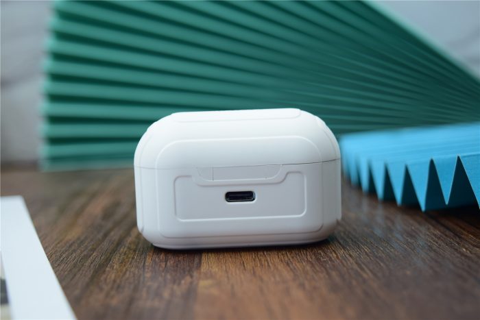 在充电仓的顶部印有“NAKA”字样,背面中间位置是充电接口,采用了目前流行的TyPe-C接口,不区分正反插,另外充电仓还支持无线充电,放置在无线充电器上即可自动进行充电,让用户使用起来更方便。