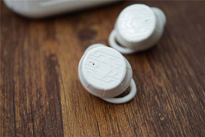 耳机正面是采用隐藏设计的圆形触控按键,其中单击左耳为音量减,长按左耳为切换上一曲,单击右耳为音量加,长按右耳为切换下一曲,双击任意耳机为播放/暂停,单击三下为唤醒语音助手。另外还有个LED指示灯,可以根据指示灯状态,查看耳机当前状态和剩余电量。