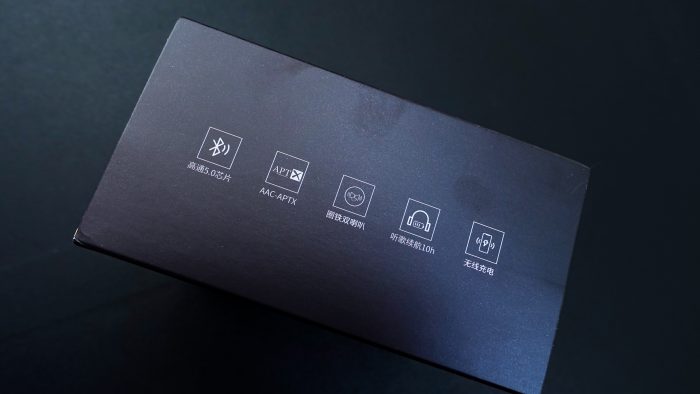 在包装盒侧面是产品卖点介绍:高通5.0芯片、AAC-APTX、圈铁双喇叭、听歌续航10h、无线充电等,接下来也会主要对各个卖点进行详细体验。