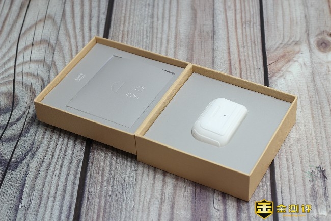打开包装就可以看到南卡T2真无线蓝牙耳机内层包装了,内层包装采用了干净的原木色显得非常纯洁。耳机和充电盒都被海绵进行固定保障了运输途中的安全,最上方是一个配件纸盒里面有各种配件。