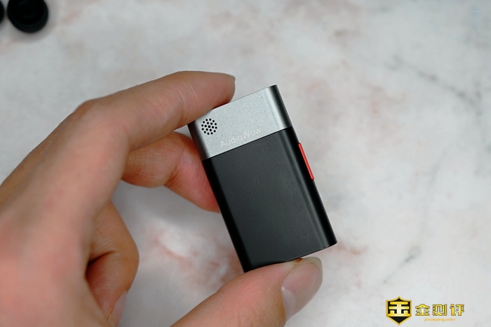 先来看一下塞宾AudioWow的整体结构,它的体积确实非常的小巧,目前有黑白两种配色,而且,这件黑色款的机身头部是铝合金材质,正面就是收音麦克风的位置,采用了6mm高灵敏度全指向电容麦克风。