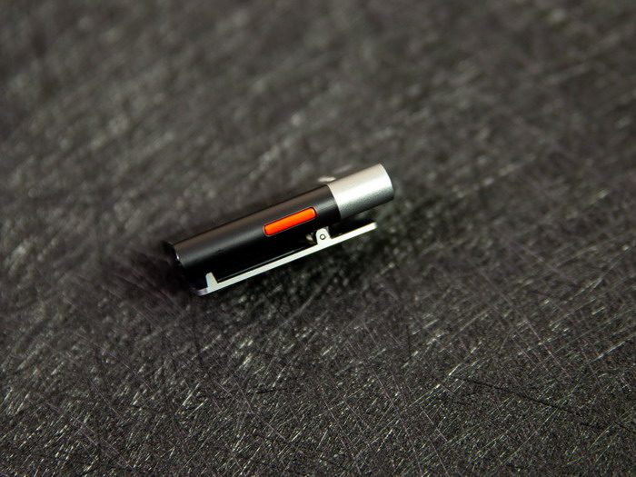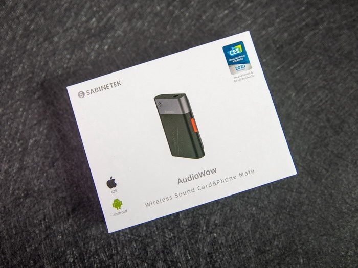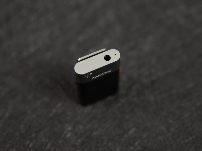 话说原本在看介绍的时候,我以为塞宾AudioWow会有一定的体积,毕竟功能这么强大,但是看到包装盒的时候我就知道比我预计的体积要小不少,而实际打开包装盒看到塞宾AudioWow,真的让我感觉很意外,虽然是说全球首选迷你无线声卡,但是居然只有这么小,三围仅有45*27*12mm,重量仅有15克。机身主体采用非常经典的银灰+黑色配色,并且通过右侧红色按键来点缀。塞宾AudioWow的正面中上方印有AudioWow的型号名,左上角设计有6mm高灵敏度全指向电容麦克风。