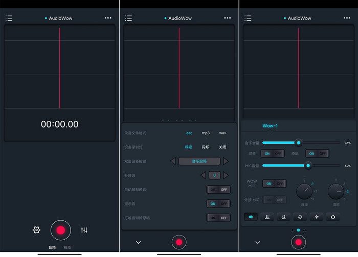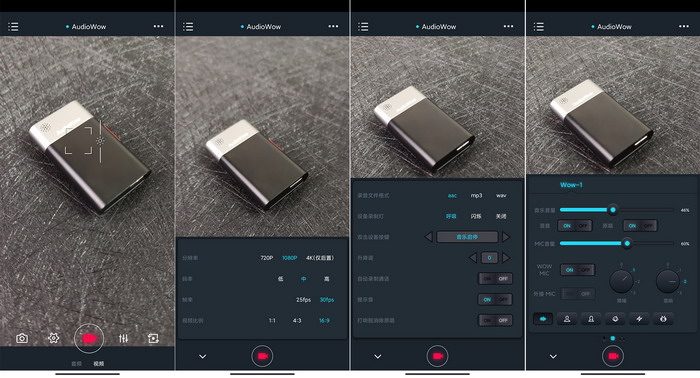 塞宾AudioWow内置DPS,涵盖了降噪、麦克风均衡、音乐均衡、混响、变声等功能。这些功能在APP里都可以实现,塞宾AudioWow的APP默认界面就是音频模式,在屏幕最下方还可以切换到视频模式。音频模式下,上方是录音的频谱界面,下方中间是开关按键,左侧是设置按键,可以设定录音文件格式,录音指示灯状态,双击开关键的功能自阴历,升降调,开关自动通话录音,开关提示音,开关打响指消除原唱,功能相当齐全。右侧则是均衡器设置,这个设置下方还有左右两个设置可切换,中间的设置可以设定音乐音量,开关原唱和混响,调节麦克风音量,开关监听,是否启用外接麦克风,并且设计有3挡降噪和混响可以调节,下方则是多种变声功能,有男声、女声、儿童、电音,机械音等。