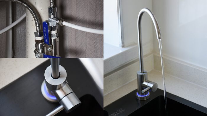 安装完成以后就可以通电开机了,首次使用需要打开三通阀和纯水开关对滤芯和管路进行冲洗,龙头指示灯为蓝色闪烁状态。刚开始出水会有灰黑色或气泡状,稍微流一会儿就变清澈了,此时指示灯会停止闪烁。另外RO反渗透滤芯中的反渗透膜含有保湿成分,安装上以后建议在前期多使用机器,出水不建议立即饮用。