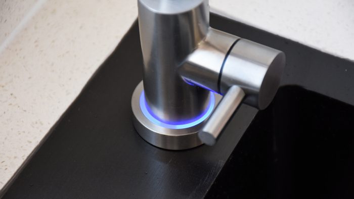 另外在龙头与洗菜盆接触固定的位置还设计了环形指示灯,不仅在出水的时候亮起作为装饰作用,同时指示灯还能以不同的颜色和闪烁状态来表示工作状态。比如蓝色常亮表示纯水正常使用,橙色常亮表示滤芯寿命到期。