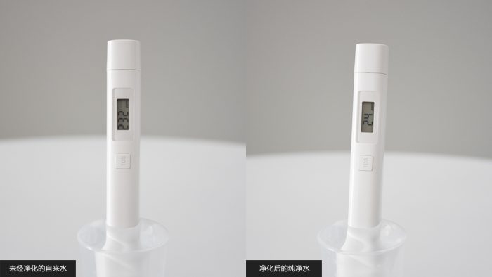 使用量杯分别接一杯净化前的自来水和净化后的纯净水,用TDS水质检测笔测试两杯水的TDS值,实测结果显示净化前的自来水TDS值为232ppm,净化后的纯净水TDS值为24ppm,对比数据再结合TDS值参考图不难发现,净化后的水质已经处于水质高的范畴,侧边印证了云米小白龙的净化能力。