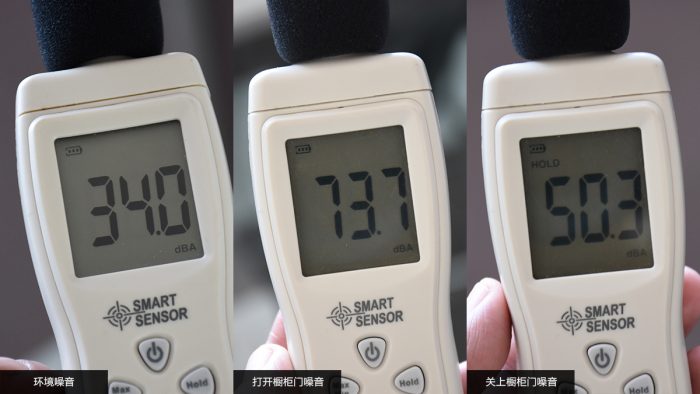另外值得一提的是,在净水器工作的时候机身会产生一定的噪音,为此我也做了测试。实测环境噪音为34db,在打开橱柜门通过纯水龙头接水时的噪音为73.7db,关上橱柜门接水时的噪音为50.3db。而日常更多的是在关上橱柜门的情况下使用,并且人也不会刻意蹲在净水器边上,因此噪音也不会很大。