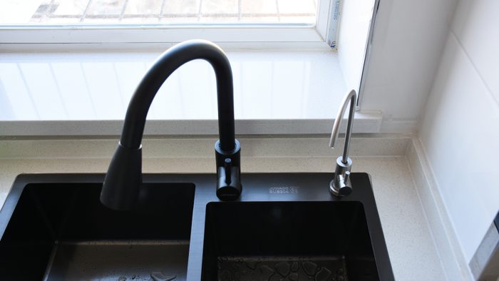 附赠的龙头采用的是304不锈钢材质,虽然银色与我这个黑色的洗菜盆有些冲突,但整体的工艺细节并不差,精致程度要比洗菜盆原装的龙头好很多。大弯头的结构也空出了很大的空间,即便是用锅或是热水壶接水的话位置也足够。开关部分采用旋转式的结构,并搭配有延长的把手,操作起来也比较方便。