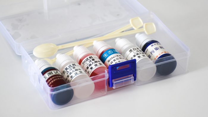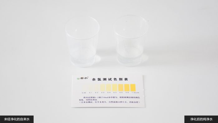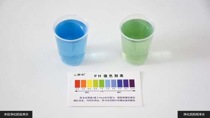 PH值用来表示水的酸碱程度,0~7为酸性,7~14为碱性,7为中性,根据医学描述,人类比较适宜饮用中性和弱碱性水,不可饮用酸性水。照例取两杯水样,分别加入PH试剂并搅拌均匀,对照色别卡可以观察到,净化前的水偏弱碱性,而净化后的水则为中性。
