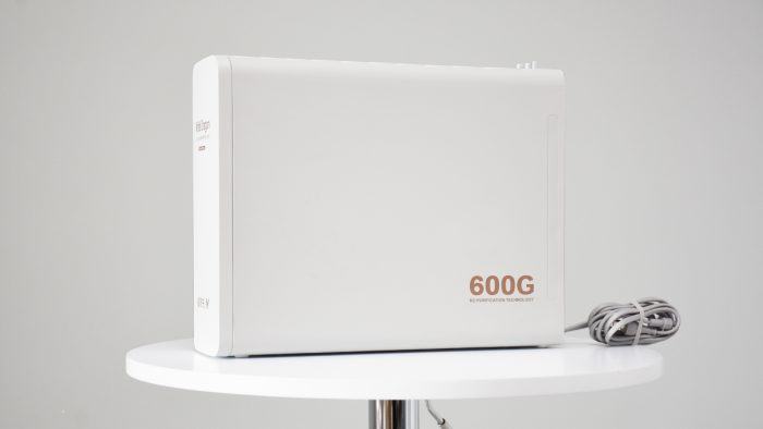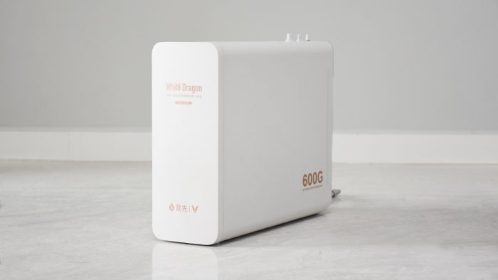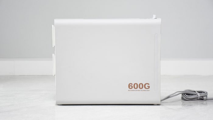 机身左右两侧比较简洁,基本上没有多余的装饰,右侧面板右下角的位置标记有600G字样,表示这台净水器的出水量是600加仑,这部分内容在后面的体验环节还会详细讲到。