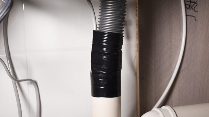 最后将浓缩水管与机身对应的接口连接,另一端则直接通道厨房预留的排水管道中,我这里直接和洗菜池的排水管道固定并用黑色胶带缠好。浓缩水管排出的水是废水,不可再次利用。