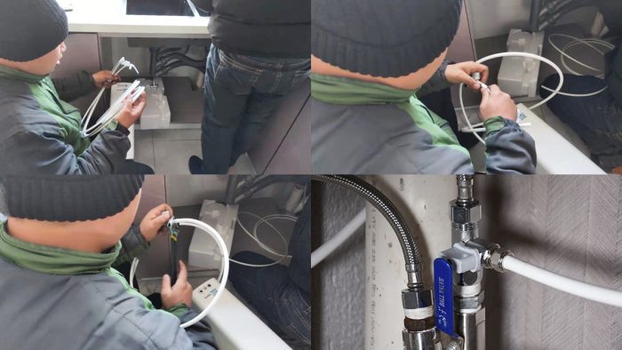 接着将纯水管与附赠的龙头连接起来,并将龙头上的线材端子与机身后方的线材端子连接,然后将龙头安装到洗菜盆上。纯水管的另一端与机身上的纯水接口连接,这个管子主要负责净化后的水进行输送。