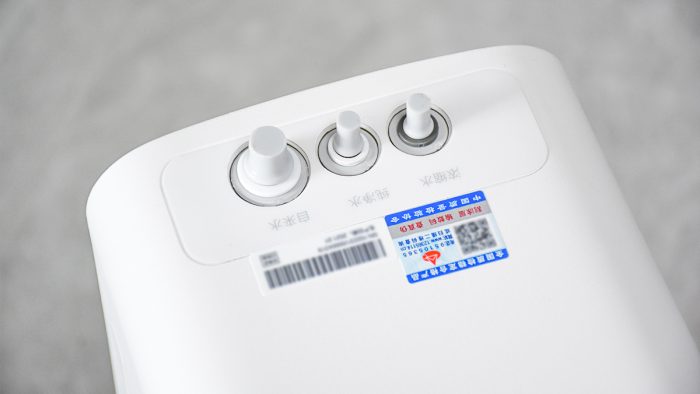 机身顶部靠后方的位置有三个连接的接口,分别是浓缩水、纯净水和自来水,其中自来水的接口要比其他两个接口粗一些,出厂的时候塞着三个皮塞堵住接口,细节之处十分用心。在三个接口前方还贴有中国质检协会的合格标签以及净水器的序列号编码。