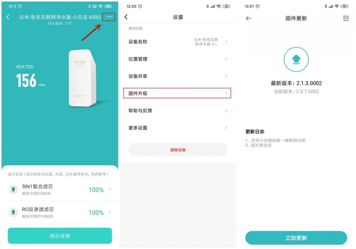 通过手机APP端,不仅能够让我们实时了解净水动态和滤芯寿命,而且还能支持固件升级,官方会不定期进行新固件推送,让净水器随时保持稳定运行。