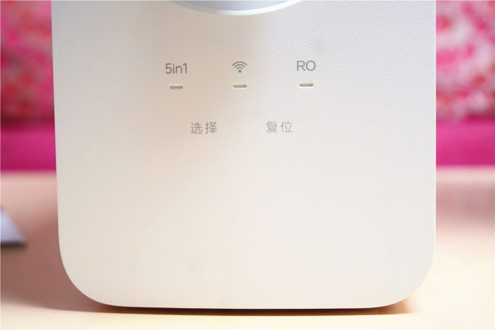 在滤芯槽下方的位置还有3颗LED指示灯,从左到右依次为5in1复合滤芯寿命指示灯、WiFi指示灯、和RO反渗透滤芯寿命指示灯,可以根据指示灯了解净水器的滤芯状态和联网情况;另外在指示灯下方还配备了“选择”和“复位”按键,采用触控设计,可以通过按键进行WiFi连接和滤芯复位等操作。