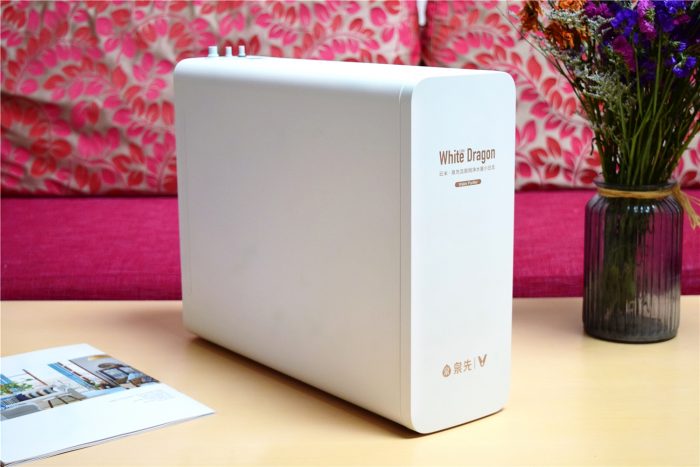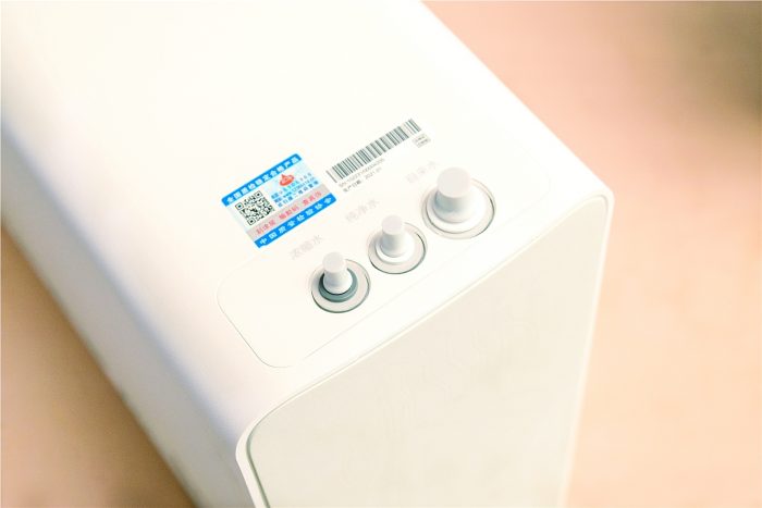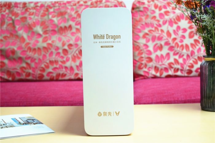 在机身正面印有产品名称和云米·泉先标识,产品全名:云米·泉先互联网净水器小白龙,同样采用金色字体,纯白配色搭配金色字体,有效提升了产品档次感。