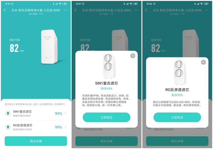 进入到云米·泉先小白龙主界面,不仅能查看进水温度、纯水TDS值,还能查看5in1复合滤芯和RO反渗透滤芯的寿命和剩余使用天数,点击滤芯后还能直接进入到滤芯详情和购买页面,更加方便用户进行更换操作。