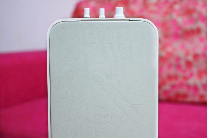 其中在机身背面位置还印有关于净水器的工作原理图,能够让用户简单了解整个净水过程,这个设计还是很有创意的,可以看到采用了一体集成水路设计,能够更有效地防止漏水。