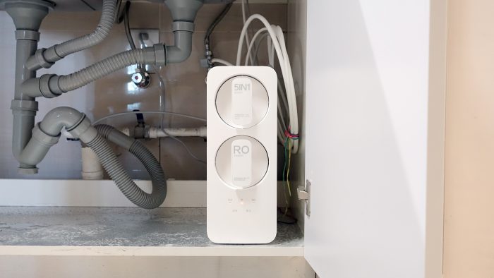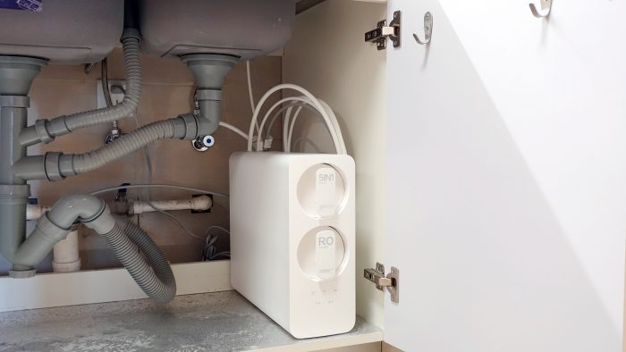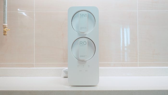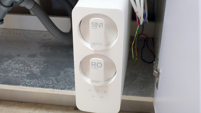 5合一复合滤芯和RO反渗透滤芯采用了竖置排列方式,上位为5合一复合滤芯。