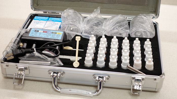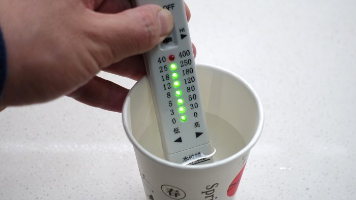 第二项是用矿物质笔检测水中矿物质含量和净水器滤芯的过滤效果,使用矿物质笔选择低档(范围是0-40ppm)进行矿物质检测,7个绿灯同时亮起,表示水质正常,水质纯度在合适的范围内。