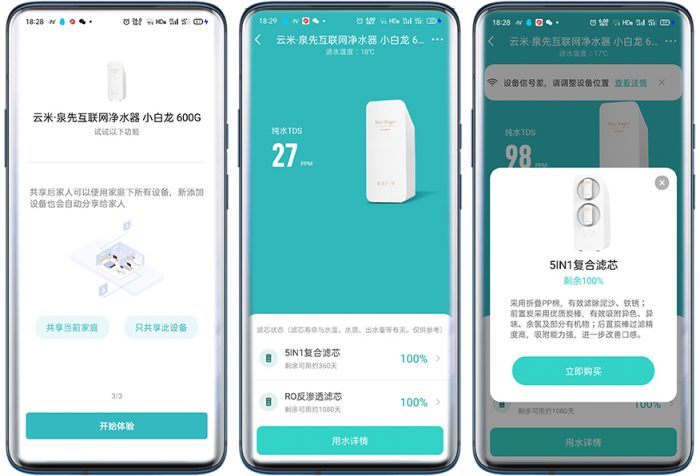 在APP上只有查看功能,可以实时查看纯水的TDS值,也可以查看滤芯的使用寿命,还可以查看使用的水流量。