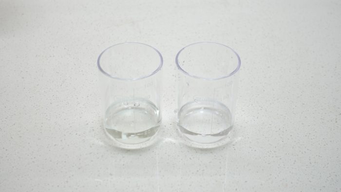 第三项是余氯测试,各取20ml自来水、纯净水,滴入两滴余氯试剂,可以看到自来水中颜色稍微变黄一丢丢,说明水中还有余氯,而纯净水中还是无色,说明水中没有余氯,证明净水器有去除余氯作用。