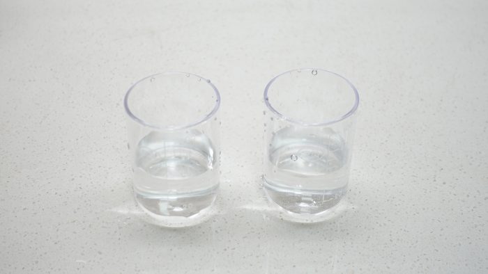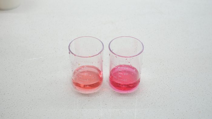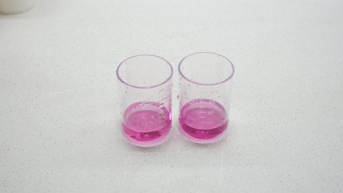第五项是钙镁离子检测,各取20ml自来水、纯净水,滴入一滴活性水试剂,两杯水都显示紫红色,表示水中含有钙镁离子,所以经过净水器过滤后的水并没有把钙镁离子过滤掉。