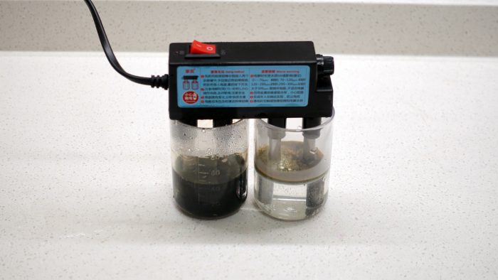 第六项为电解水测试,各取50mm自来水、纯净水,将电解器的铁棒铝棒分别放入待测水样中,经过两分钟电解,可以发现自来水已经变为黑色,说明自来水中含有锌、铅、汞、铜、铬、锰、镉等重金属,而纯净水只有水表少许变色,说明净水器的效果还是比较给力的。
