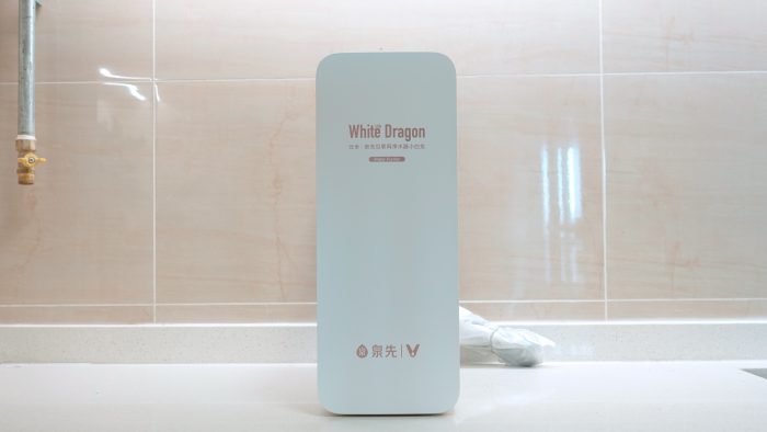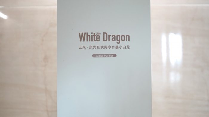 在机身正面是“Little White Dragon”字样的小白龙标识,在“Little White Dragon”是产品名——云米·泉先互联网智能净水器小白龙,以及用“Water Purifier”英文标注了净水器。