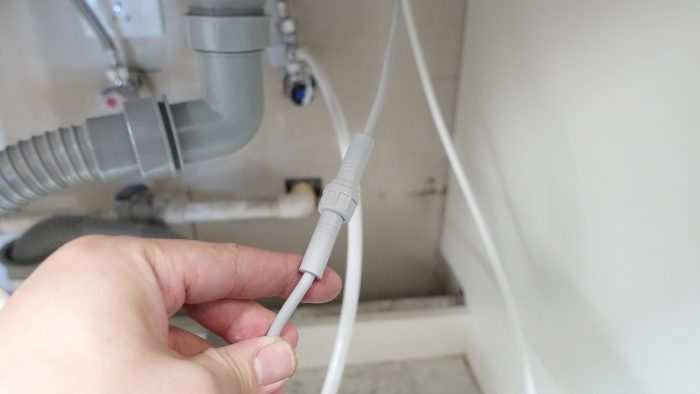 然后将龙头的电源端子与净水机的电源端子连接起来,用固定阀将其固定。