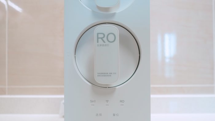 下位为RO反渗透滤芯,光从外观上判断,并不知道两根滤芯的区别,但是两根滤芯的把手上都用中英文结合标注了两根滤芯的区别。在RO反渗透滤芯的下方是净水器工作指示灯和触摸按键,这三颗指示灯从左往右依次为5in1、WiFi、RO工作时的指示灯。