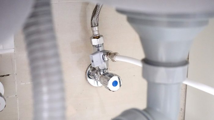 将自来水软管插入三通阀中,用固定螺丝将自来水软管固定好。
