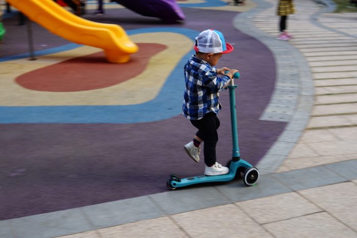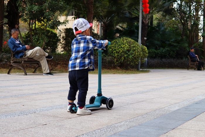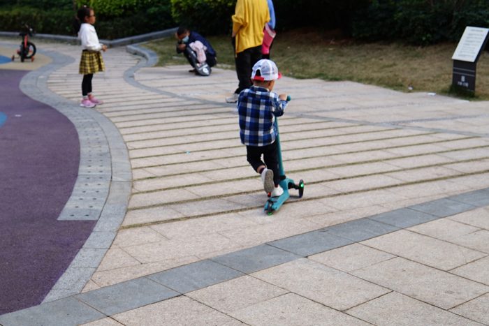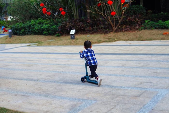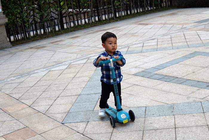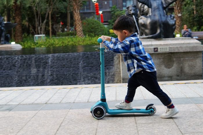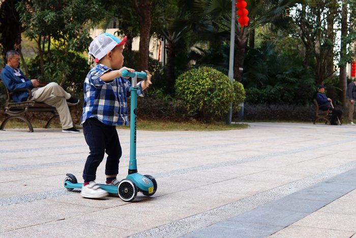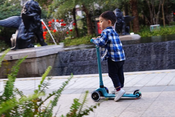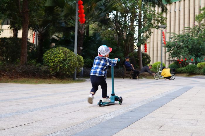 滑板车的整体重量约为2.5kg,推拉骑行都很轻盈,虽然这是我儿子的第一个滑板车,但上手两次后,他现在已经玩得很溜了,滑行速度很快,有时还要小跑几步才能追上他。只是他还不太熟悉后轮刹车,在下坡路段还得格外注意下,无论是摔倒还是撞到其他小朋友,可都是件麻烦事。
