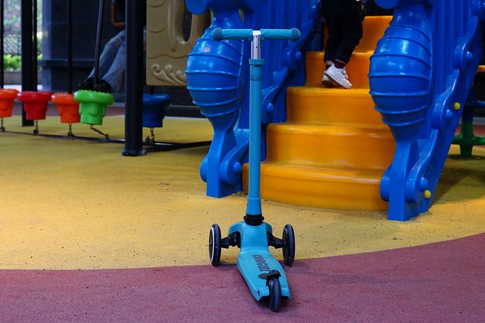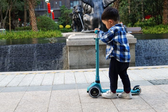 三轮式滑板车最大优点就是安全,滑行时稳固性很好,闲置是车身可自行站立,常规路面都能放心的让他自己去玩。硅胶握把很厚实,握持舒适还比较防滑,小孩玩耍的安全有保障。按我儿子目前90cm的身高,车把高度放到最低档位时刚刚好,滑行握持和转向小孩都能很快上手。
