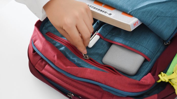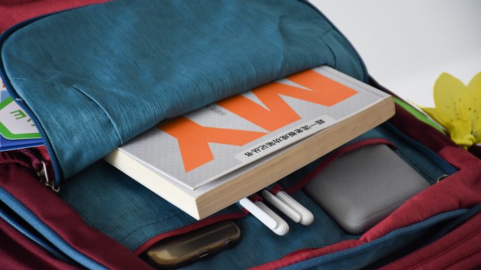 最外侧的一层是多功能储物仓,容量虽然不是很大,但却设计了两个比较大的储物兜和两个收纳签字笔的位置,日常可以将手机、充电宝和签字笔放在这个位置,下面比较深的兜里还可以插上一两本经常看的书或者是iPad。